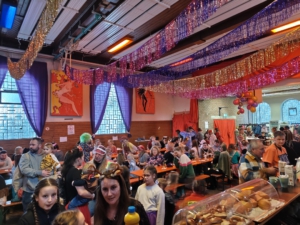Am Rosenmontag stürmten pünktlich um 14.11 Uhr alle kleinen und großen Gäste die Alte Halle am Gymnasium. Die Kinder wurden von unserem Programmteam, Romina Wylezik und Alex Steindor, närrisch durch den Nachmittag geführt. Es gab viele Luftschlangen, Süßigkeiten und strahlende Gesichter. Als Highlight im Jubiläumsjahr wurde eine Fotobox-Station aufgebaut. Jede Familie konnte sich hier ein Andenken an den Kinderfasching erstellen lassen und mit nach Hause nehmen.